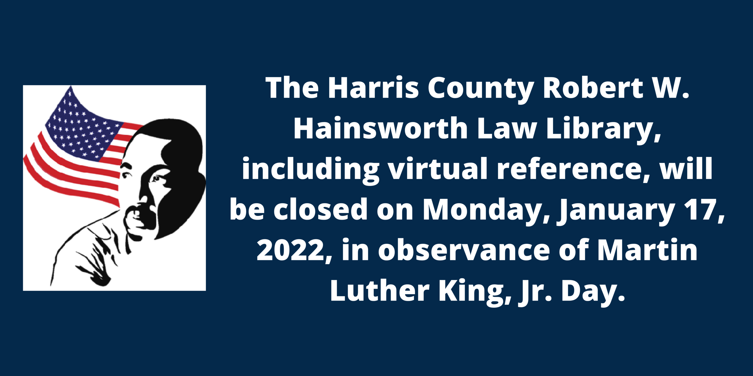 Closed January 17 for a County Holiday Monday, January 17, 2022 8:00 AM 5:00 PM 08:00 17:00 Harris County Robert W. Hainsworth Law Library 1019 Congress Houston, Texas 77002 (map) Google Calendar ICS