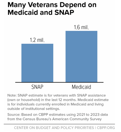 The Center on Budget and Policy Priorities (CBPP, 2025) reports that nearly 1 in 4 veterans live in households that rely on the Supplemental Nutrition Assistance Program (SNAP) and Medicaid. The VA provides veterans with a wide range of services, including healthcare, housing, life insurance, pensions, and education services; nearly a quarter of VA employees are veterans. However, recent proposals to reduce federal spending plan to axe 83,000 VA jobs and reduce funding for SNAP and Medicaid (PBS, 2025).